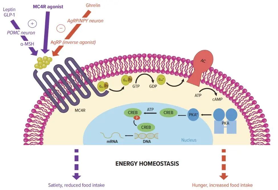 α - ´ÙºÚËØÏ¸°û¼¤ËØ£¨α-MSH£©¶ÔºÚƤÖÊËØÊÜÌå4£¨MC4R£©µÄ¼¤»î»áµ¼ÖÂGÂѰף¨Gαs£©»î»¯£¬ËæºóÏÙÜÕËá»·»¯Ã¸£¨AC£©±»¼¤»î£¬AC½«ÈýÁ×ËáÏÙÜÕ£¨ATP£©×ª»¯Îª»·Á×ÏÙÜÕËᣨcAMP£©¡£»·Á×ÏÙÜÕËᣨcAMP£©½éµ¼µÄÂѰ׼¤Ã¸A£¨PKA£©µÄ»î»¯»áµ¼ÖÂPKA¸´ºÏÎï´ß»¯ÑÇ»ùµÄ½âÀë¡£µ±ÓлîÐÔµÄPKA´ß»¯ÑÇ»ù£¨PKA*£©×ªÒÆÖÁϸ°ûºËºó£¬PKAʹת¼Òò×Ó»·Á×ÏÙÜÕËá·´Ó¦Ôª¼þÍŽáÂѰף¨CREB£©Á×Ëữ¡£µ±»·Á×ÏÙÜÕËá·´Ó¦Ôª¼þÍŽáÂÑ°× - Á×Ëữ£¨CREB-P£©ÓëÉÏÓÎÒ»ÖÂÐÔDNAÐòÁУ¨»·Á×ÏÙÜÕËá·´Ó¦Ôª¼þ£¬CRE£©½áÊÊʱ£¬Ëüͨ¹ýÓë½¹µãת¼»úÖÆÏ໥×÷ÓÃÀ´Ôö½ø´úлÓëÄÜÁ¿Æ½ºâµ÷ÀíÏà¹Ø»ùÒòת¼¡£